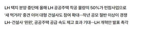 Á¤ºÎ °ü°èÀÚ´Â "LH°¡ ÅÃÁö ºÐ¾çÀ» Áß´ÜÇÏ¸é¼ °ø°øÁÖÅà °Ç¼³ ¸ðµ¨·Î ¹ÎÂü»ç¾÷ÀÌ ´ë¾ÈÀÌ µÉ °Í"À̶ó¸ç "ÇöÀç ¼ö¸³ÁßÀÎ LH ±¸Á¶°³Çõ, Áְź¹Áö·Îµå¸Ê µî¿¡ µû¶ó ÇâÈÄ LH ÀÚü »ç¾÷°ú ¹ÎÂü»ç¾÷ÀÇ ±Ô¸ð°¡ °áÁ¤µÉ °Í"À̶ó°í ¸»Çß´Ù.